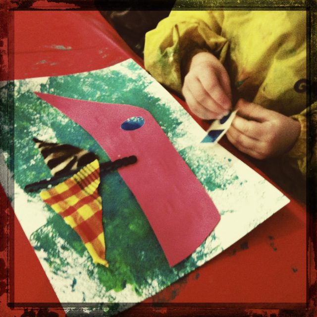 L’atelier a été un succès – Les activités par leur diversités ont fait filer le temps (1h et moi qui croyait que ce serait long pour B.): pochoirs, collages, pate à modeler : tout un arsenal de créativité!!!
