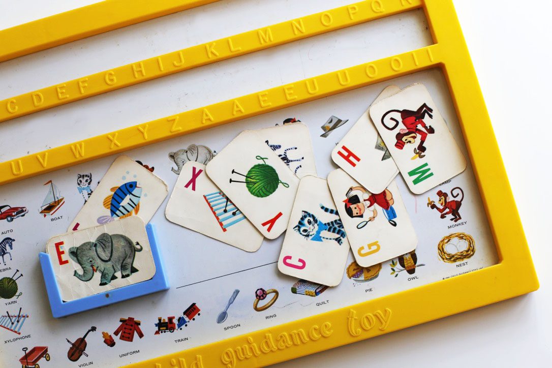 Et comme je saisis n’importe quelle occasion en ce moment pour vous montrer mes petits trésors vintage, j’en profite pour vous montrer les jeux que je laisse à disposition de Bérénice autour de cette thématique. Il y a évidemment le très célèbre pupitre Fisher Price avec ses fiches évidées qui permettent d’allier jeu et apprentissage.