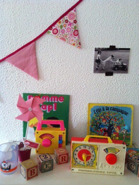 Dans la chambre de Bérénice on trouve une jolie guirlande fleurie, des boites à musique vintage Fisher Price qu”elle aime écouter au moment de s’endormir, des cubes en bois chinés avec lesquels je compose souvent son prénom.